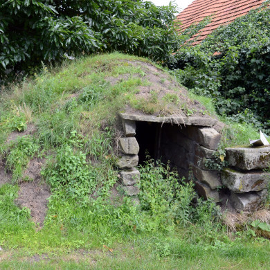 Iets verdiept gelegen aardappelkelder, geheel opgetrokken uit grote blokken Bentheimer zandsteen. Een overluifelde houten deur geeft toegang tot de door een tongewelf overkoepelde kelder met een iets schuin geplaatse achterwand. Voor de houten deur twee keermuurtjes -eveneens van zandsteen- met daarop de luifel. De kelder is aan de buitenzijde geheel bedekt met aarde, gras en mos; alleen bij de entree is zandsteen zichtbaar.