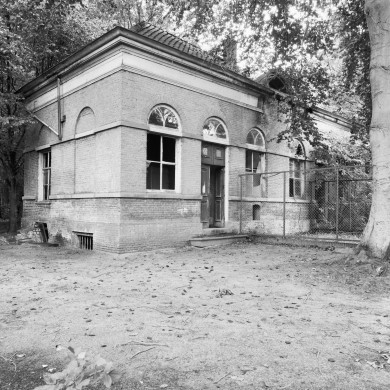 BOUWHUIS. Direct ten noorden van het hoofdgebouw staat een bakstenen bouwhuis uit het midden van de 19de eeuw. Het op rechthoekige grondslag opgetrokken gebouw bestaat uit een bouwlaag onder een met pannen gedekt schilddak. De gevels, behalve de achtergevel, zijn voorzien van een geprofileerde kroonlijst en kennen een horizontale geleding van hardstenen lijsten (speklagen) ter hoogte van de onder- en bovendorpels van de kozijnen. De symmetrisch ingedeelde voorgevel heeft vierruitsvensters met halfronde bovenlichten en twee dubbele paneeldeuren. In het midden van het dakschild een halfronde dakkapel met tuimelraam.