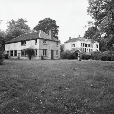 KOETSHUIS. Terzijde van het huis staat een schuin geplaatst koetshuis gebouwd in opdracht van A. Sandberg in 1843 (zie gevelsteen). Het op rechthoekige grondslag opgetrokken pand met donkere plint bestaat uit twee bouwlagen onder een met gesmoorde Hollandse pannen gedekt schilddak. De grof gestuukte gevels kennen een horizontale geleding van speklagen/stroken ter hoogte van de onder- en bovenzijde van de vensters op de begane grond. De gevels zijn ingedeeld met openslaande vensters; in de noordzijde de inrijdeuren.