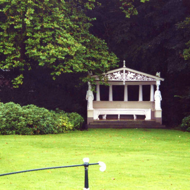 TUINBANK. Terzijde van het huis aan het voorplein staat een prieelvormige halfronde tuinbank in neo-Pompejaanse/classicistische stijl, een zogenaamd stibadium naar ontwerp van H. Wentzel afkomstig van het huis De Paauw in Wassenaar en sinds 1929 op Het Laar. Het prieel is opgebouwd uit een halfrond natuurstenen basement met vier treden, daarop een natuurstenen borstwering met aan weerszijden een zinken Kariatide en een halronde rij Dorische zuilen, die een houten lijst dragen waarop de dakconstructie rust; voorzijde met een opengewerkt een timpaan met zinken versieringen met gevleugelden. Inwendig een halfronde houten bank en een marmeren vloer.