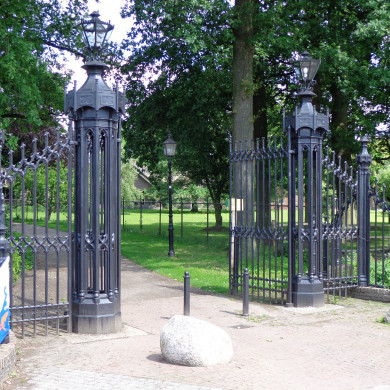 TOEGANGSHEK. Aan de Stationsweg staat een 19de-eeuws (XIXc) gietijzeren hek in neogotische stijl staande op een brug met gebogen bakstenen keermuren en een sluis. Dubbel spijlenhek tussen opengewerkte (bundel)pijlers met een torenvormige bekroning; aan weerszijden schuin aflopend spijlenhek met tracering in vierpasmotief en een kleinere pijler eveneens met torenvormige bekroning; spijlenhek op de keermuur.
