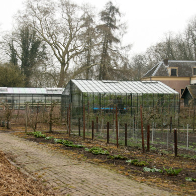 In de moestuin staat een vroeg-20ste-eeuwse kas van het serre-type op vierkante grondslag met een betonnen voet waarop een ijzerconstructie met glas. Houten toegangsdeur.