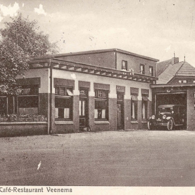 CAFÉ met BOVENWONING en DOORRIT volgens een gevelsteen gebouwd in 1928 in opdracht van B. Veenma. Het pand, dat is opgetrokken in een regionale variant van het kubistisch Expressionisme, verving een oude pleisterplaats met doorrit op de toenmalige doorgaande route Groningen-Friesland. Na een aantal jaren van leegstand, is in 1985 het gebouw verbouwd en gerestaureerd toen de huidige eigenaar het weer in gebruik wilde nemen als horecapand. De serre werd bij het café getrokken en voorzien van nieuwe kozijnen.