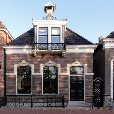 Het schilddak is gedekt met een grijze Friese pan en heeft een gemetselde nokschoorsteen. De geprofileerde gootlijst wordt doorbroken door een dakkapel met een Frans balkon op voluutconsoles; voor de H-vensters is een sierlijk gietijzeren hek aangebracht. De -overigens eenvoudige- dakkapel wordt gesierd door schijnpilasters met composietkapiteel.