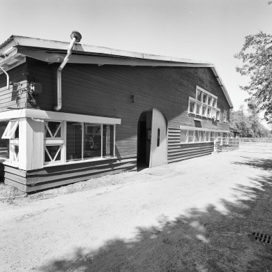 De westgevel heeft openslaande deuren onder een bovenlicht en in de topgevel een deels dichtgezette vensterreeks. Aan de westgevel een later toegevoegde open aankapping die buiten de bescherming valt.