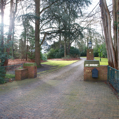 Ter weerszijden van de oprijlaan twee gemetselde HEKPIJLERS, afgedekt met natuursteen, waarop de naam 'De Dobbe'