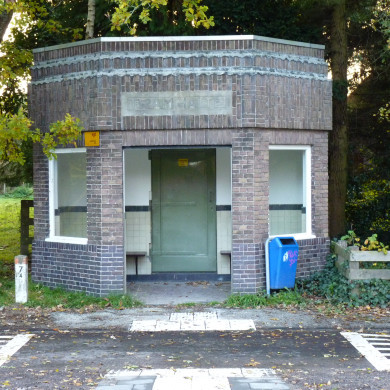 TRAMWACHTHUISJE annex TRANSFORMATORGEBOUW op rechthoekige plattegrond met aan de voorzijde afgeschuinde hoeken, is opgetrokken in bruine baksteen op een iets naar voren springend trasraam van gesinterde baksteen en wordt gedekt door een plat dak; bakstenen fries dat naar boven toe terugspringt waartussen decoratieve loodslabben.