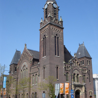 KERK (en ORGEL) met CONSISTORIE van de Remonstrantse gemeente, gebouwd in 1895-1897 in Overgangsarchitectuur met neo-Romaanse elementen ontworpen door H. Evers en J.P. Stok Wzn.