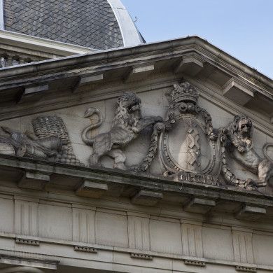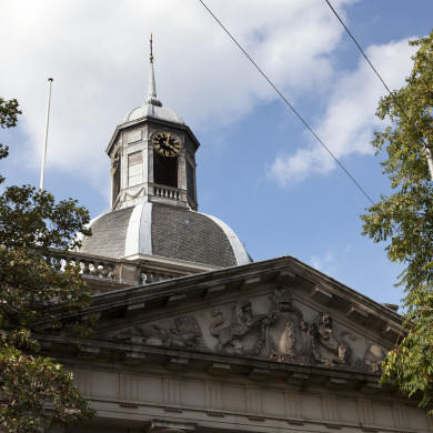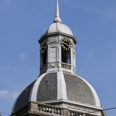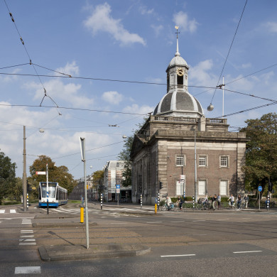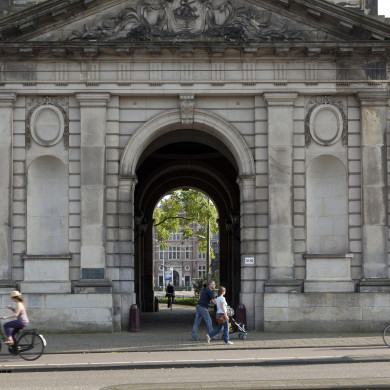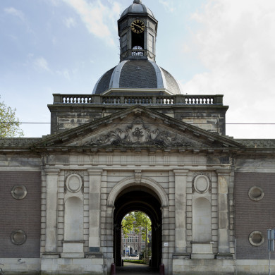 Muiderpoort. Vlak gedekt rechthoekig gebouw, het verhoogde middengedeelte bekroond door een koepeltoren, de poortdoorgangen in zandsteen op de wijze van een triomfboog omlijst en door frontons gedekt (1770, door de stadsbouwmeester Cornelis Rauws).