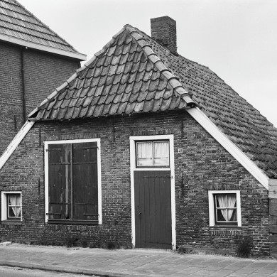 De achterzijde (N) heeft eveneens een deur met bovenlicht en zijlicht en een tweede venster. Ook deze gevel wordt door eenvoudige windveren afgesloten.