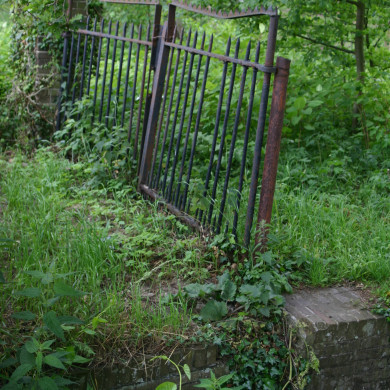 TOEGANGSHEK. Ten westen van de huidige hoofdingang bevindt zich een toegangshek, thans in vervallen staat (1999), gesitueerd op een duiker met gemetseld tongewelf. Het hek bestaat uit twee gemetselde pijlers met hardstenen dekplaten; smeedijzeren dubbel spijlenhek.