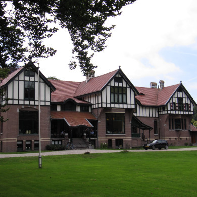 Het langgerekte gebouw heeft centraal de ingang met aan weerszijden twee uitspringende bouwdelen met een topgevel. De twee zijvleugels die vanaf de uitspringende delen lopen worden beide afgesloten met een uitspringend blok met topgevels. In het westelijke blok bevindt zich de conciërge-woning. De achterzijde heeft centraal een uitspringend bouwdeel met topgevel en ronde erker. Tussen dit middendeel en de bouwblokken aan de kopse zijden is een forse veranda aangebracht onder een overstek van de verdieping.
