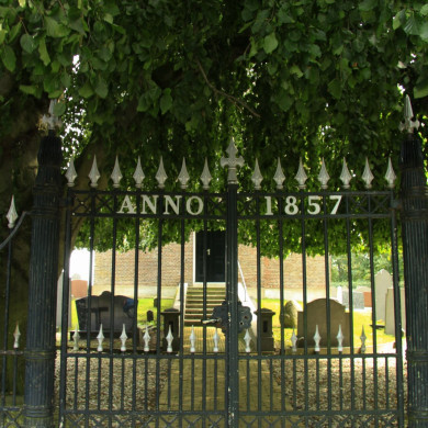 Gietijzeren hek op bakstenen dam, bestaande uit twee midden- en twee zijvleugels tussen gecanneleerde pijlers op hardstenen basement; de spijlen zijn om en om afgezet met speerpunten, de pijlers met dubbele hellebaarden. De naald wordt bekroond door een kruisvorm, zijnde een combinatie van een speerpunt en een hellebaard. Aan de onder en bovenzijde diagonaal gekruiste vakken. Aan de bovenzijde, respectievelijk links en rechts, het opschrift 'ANNO' '1857'.