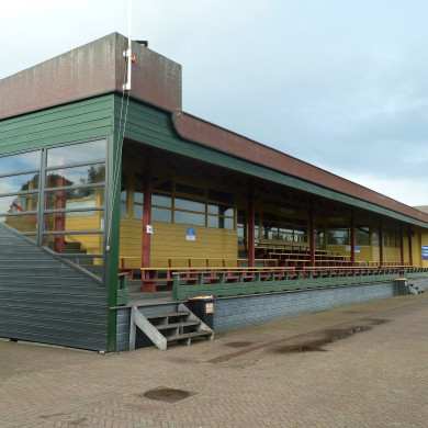 Aan de noordzijde van het langgerekte TRIBUNEGEBOUW liggen de kantine, de bestuurs- en kleedkamers met verdieping en, aan de zuidzijde, de (verkorte) tribune, die qua volume en gevelrooilijn alle variëren. Onder de tribunes zijn bergingen gesitueerd. De kleedkamers zijn tegenwoordig in gebruik als opslag. De bestuurskamer had een balkon dat is dicht gezet. De keuken en het bar-gedeelte van de kantine zijn vernieuwd.