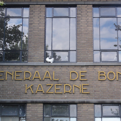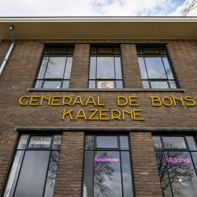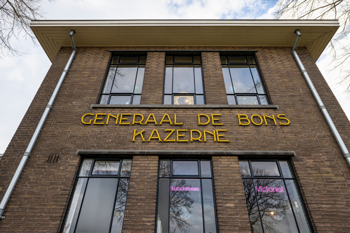 Markante elementen in het gebouw is de drielaags trappenhal aan de oostelijke zijde. Deze is boven de rondbogige ingangspartij voorzien van een over de gehele hoogte overhoeks geplaatste glas-in-lood schacht, bekroond door een uurwerk (Koninklijke Eijsbouts, 1939). De zuidelijke gevel heeft een eenvoudige ingangspartij onder luifel, bestaande uit een opgeklampte vleugeldeur. De zuidelijke achterbouw is, in tegenstelling tot de noordelijke en oostelijke vleugel, eenlaags. De aan de straatzijde tegen de noordelijke gevel aangebrachte tekst met de naam van de kazerne: "Generaal de Bons / kazerne", is zoals bij de andere kazernes uit deze serie vervaardigd van met de hand gesmede, deels opengewerkte ijzeren letters.