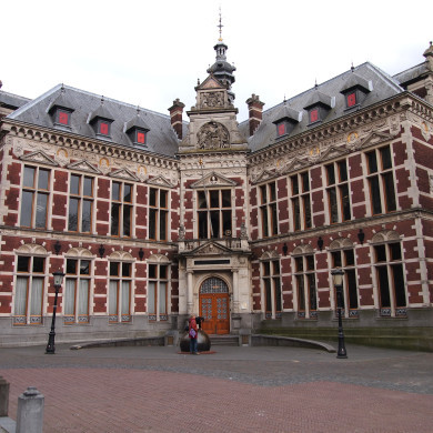 UNIVERSITEITSGEBOUW van de Universiteit Utrecht, gebouwd in 1891-1894, met bijbehorende uitbreidingen, vooral uit de periode 1917-1924. Het hoofdgebouw, gelegen in de zuid-oosthoek van het Domplein, is geschonken door de Utrechtse burgers ter gelegenheid van het 250-jarig bestaan van de Universiteit. Aan het ontwerp van E.H. Gugel en F.J. Nieuwenhuis in neo-renaissance ging een nationale polemiek vooraf, waarin aan de keuze tussen neo-gotiek en neo-renaissance een politieke lading gegeven werd.
