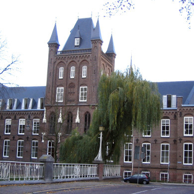 Interieur van het hoofdgebouw met centraal trappenhuis in de middentoren, doorlopend tot in bovenste deel van de toren. In het hoofdgebouw op de bel-etage een entreehal en de diverse gangen die hier op uit komen. In de hoofdgang zijn de oorspronkelijke deuren en lambrisering aanwezig, onder meer die naar de bestuurskamer. Hier bevindt zich een grote gotische schouw en zandstenen consoles die de moerbalken van de samengestelde kap dragen, beide afkomstig uit het middeleeuwse huis Zoudenbalch, voorts een oorspronkelijke parketvloer en lambrizering.