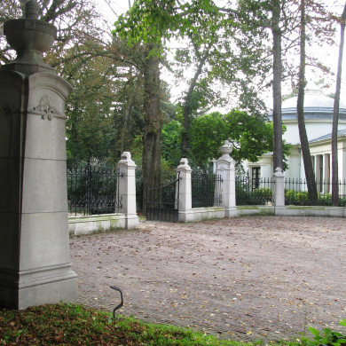 HEK in neo-classicistische vormgeving uitgevoerd, bedoeld ter afscheiding van de eigenlijke begraafplaats en het monumentale voorplein. Het elegant vormgegeven ijzeren hek staat op een stenen plint en tussen hardstenen stéles van verschillende afmetingen en met diverse decoraties, ondermeer een bekroning in de vorm van urnen en palmetten.