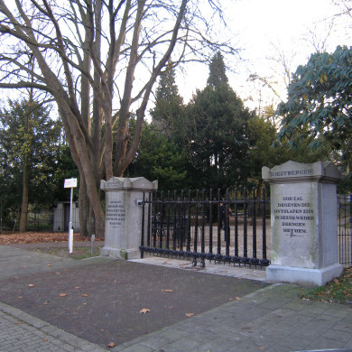 In neoclassicistische trant uitgevoerd TOEGANGSHEK tot de Eerste Algemene Begraafplaats 'Soestbergen' uit 1830, bestaande uit twee hardstenen, aan de straatzijde van inscripties voorziene pijlers met plint met vierkante schacht (voorzien van bijbeltekst) en tombevormige bekroning met vlakke frontons en acroteria (voorzien van begraafplaatsnaam), en twee gietijzeren draaihekwerken met een herhaald motief van omgekeerde toortsen.