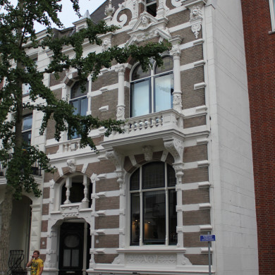 In 1889 gebouwd WOONHUIS in zeer rijke eclectische stijl, oorspronkelijk fungerend als stucadoorswerkplaats met bovenwoning.