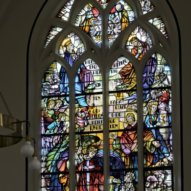 Interieur met kruisribgewelven, glas-in-loodvensters en neogotisch kerkmeubilair, onder meer een altaar en diverse kandelaars en stoelen.