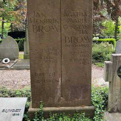 GRAFMONUMENT (complexonderdeel 8) bestaande uit eenvoudige staande steen met strak kruis, aan weerszijden van het kruis de teksten: JAN HENDRIK BROM/ * 21 juli 1860/ T 1 febr 1915/ Dat zij rusten, en: AGATHA MARIA CONSTANTIA BROM DE CHARRO / 29 aug 1862 /T 16 nov 1934/ in vrede. Naar ontwerp en uitvoering van Brom, lid van het Bernulphusgilde.