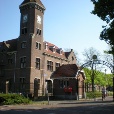 POORTGEBOUW van twee bouwlagen gelegen aan de Prins Hendriklaan op u-vormige plattegrond met aan de noordzijde een dwars bouwdeel met op de kop een toren, evenwijdig aan de Prins Hendriklaan is het acht traveëeen lange bouwdeel gelegen. Het gebouw is gedekt met een pannen schilddak, de toren met een tentdak. De noordgevel aan de Prins Hendriklaan heeft aan weerszijden twee tot topgevel opgetrokken traveeën. In de gevel diverse soorten vensters, ondermeer gekoppelde rondboogvensters, enkelvoudige vensters en kruisvensters, sommigen met glazen bouwstenen, andere met glas met roedeverdeling, boven de vensters ondermeer korfbogen met siermetselwerk, rondbogen met hardstenen sluitstenen en hardstenen lateien. Aan de westzijde op de begane grond een uit drie bogen bestaande arcade, alle drie de bogen uitgevoerd met hardstenen blokken. Binnen de arcade ondermeer geglazuurde baksteen decoratie. Voor de arcade een stenen bordes. In de tweede bouwlaag driemaal een dubbel kruisvenster, uitgevoerd in hardsteen. Voorts op de begane grond een tegen de gevel aangezet houten afdak, daarboven in de gevel een stenen kruisvenster, in de geveltop een rond venster. De toren bezit in de bovenste geleding afgesneden hoeken boven hardstenen hoekblokken die deze overgang accentueren. In de gevels van de toren stenen kruisvensters, met in het bovenste deel aan alle zijden galmgaten en klokken, tevens opschriften als "Rust Roest", "Zijt op tijd" en "Tijd slijt". In de kap diverse dakkapellen in chaletstijl.