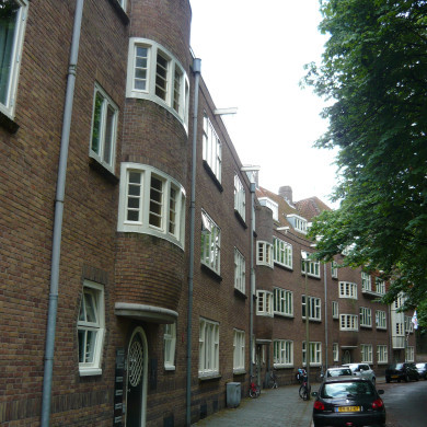 Complex FLATWONINGEN in opdracht van woningbouwvereniging `Het nieuwe Woonhuis' gebouwd in 1924 naar ontwerp van de architecten Jan en Theo Stuivinga in Amsterdamse Schoolstijl.