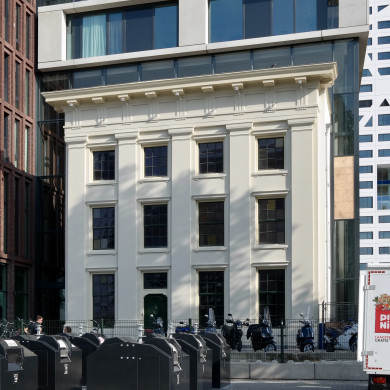 Het aan de straatzijde gesitueerde bouwdeel van drie bouwlagen is geplaatst voor een ouder, bij de verbouwing behouden deel.