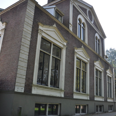 De symmetrisch ingedeelde VOORGEVEL heeft gepleisterde hoekpilasters in blokverband en bevat in de plint vier gedeelde vensters met 2-ruits ramen. De bel étage heeft vier tweelichten met 2-ruits stolpramen en enkelruits bovenlichten. Het dakhuis heeft gepleisterde hoekpilasters met casementen. Het dakhuis wordt beëindigd met een gepleisterd fronton met cirkelmotief. Het timpaan is uitgevoerd in schoon metselwerk. De gevel bevat hier twee tweelichten met 2-ruits stolpramen en halfronde enkelruits bovenlichten. De tweelichten zijn elk gevat in één gepleisterde halfronde omlijsting.
