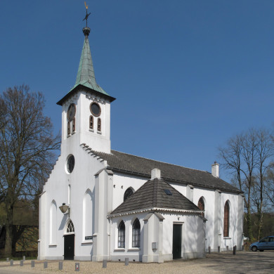 Vrijstaande KERK met aangebouwde CONSISTORIEKAMER van de Hervormde Gemeente Hoenderloo aan de Heldringsweg te Hoenderloo. De kerk is in 1857-1858 gebouwd in opdracht van dominee Otto Gerhard Heldring (1804-1876) naar ontwerp van W. de Waal uit Arnhem uitgevoerd door aannemer W. Lensink uit Arnhem. De eerste steen is op 29 augustus 1857 gelegd door de dochter van Heldring, Louise. De inwijding van de kerk vond plaats in 1858 tijdens het Pinksterfeest.
