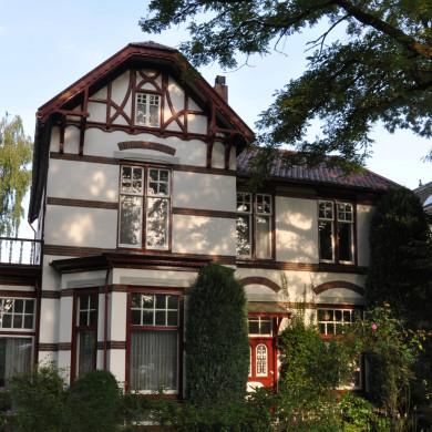 Vrijstaande villa uit de vroege twintigste eeuw, gebouwd in Overgangsarchitectuur.