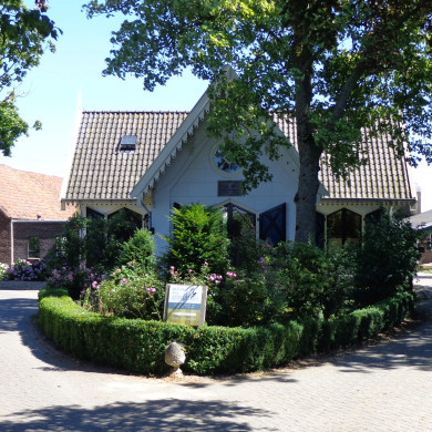 Het voorhuis bevat dubbele keperboogvormig draaivensters of dubbele glasdeuren met X-vormige roedeverdeling en luiken. In de topgevels zijn ronde vensters geplaatst, deels voorzien van roedeverdeling en deels met een draaivenster.
