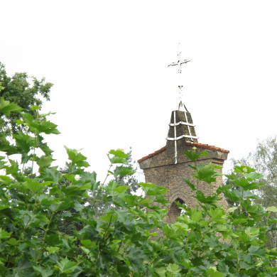 De voorgevel (westzijde) heeft een bijna symmetrische indeling van drie vensterassen. Rechts van de middenas bevindt zich een open klokkentoren, bestaande uit een massieve, hoog opgaande muur, waartegen aan de uiteinden steunberen zijn gemetseld. In de top is een spitsboogvormige uitsparing, waarin een klok is bevestigd. Op de puntvormige bekroning is een smeedijzeren kruis bevestigd.
