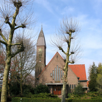 Tegen de linkerzijgevel is in de oksel met het transept een toren gezet op vierkante plattegrond. De toren wordt naar boven toe trapsgewijs smaller en is voorzien van smalle vensters, galmgaten en wijzerplaten, die zijn uitgevoerd in keramische tegels. De leien gedekte en iets conische spits heeft een loden bekroning. Het transept heeft een iets geringere nokhoogte en bevat een samengesteld venster, bestaande uit smalle vensters, gescheiden door muurdammen. De hoofdvorm van het venster is een driehoek.