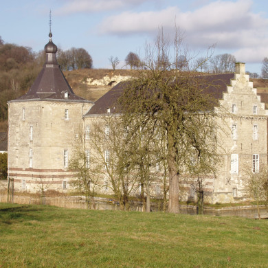 KASTEEL; omgracht, in oorsprong middeleeuws gebouw in mergel en baksteen op L-vormige plattegrond; op de hoek (noordwestpunt) een uitspringende forse vierkante toren; samen met de binnenplaats vormt het gebouw een vrijwel vierkant eiland; de binnenplaats heeft een keermuur in mergel met lage borstwering; de westelijke kasteelvleugel, XVI-XVII, heeft twee bouwlagen boven de kelders; mergel, alleen noordgevel in baksteen (18e eeuws); zadeldak met drie nokschoorstenen en trapgevel aan zuidzijde en schild aan noordkant; de lange muur aan de grachtzijde heeft direct onder de parterreramen drie brede banden in baksteen, die in de vier torengevels doorlopen; ramen met meerruitsvensters en blokvormig omlijst met hardsteen; onder de goot een fries met gotische boogjes; dubbele ingangsdeur in de oostgevel op de binnenplaats; de zware toren, ongeveer 1500, is in mergel uitgevoerd en heeft boven de kelder drie verdiepingen; de bovenste correspondeert met de kapverdieping van de westvleugel; smalle meerruitsvensters; achtkantig, aan de voet sterk geknikt dak, dat eindigt in een uivormige spits; daarop windvaan met jaartal 1620; de noordvleugel, XVIII, in baksteen en enkele meters tot aan de gracht verlengd in de 19e eeuw, heeft boven de kelders één hoge verdieping en daarboven een verdieping in de mansardekap; symmetrische gevels aan buiten- en courzijde (afgezien van de verlenging): in het midden een rijk omlijste risalerende poortdoorgang met links en rechts telkens twee licht getoogde meerruitsvensters met hardstenen omlijstingen; Régence poortomlijsting in mergel en hardsteen, boven de gootlijst doorlopend in halfrond fronton met drie vazen en door rocaille omlijste alliantiewapens, waaronder een getoogd meerruitsvenster; in de omlijsting, ter weerszijden van de poort een smal getoogd venster. Boven de poortdoorgang aan de courzijde een zonnewijzer ter breedte van de poort. Alle kasteeldaken met leien gedekt. Inwendig onder meer: van oorsprong vrij hangende steektrap, XVIII, met forse vierkante vaasvormige balusters, alles in eikenhout; diverse kamers met stucplafonds en eiken parketvloeren en betimmeringen, XVIII. In salon Lodewijk XV- schoorsteenmantel van bruingeaderd marmer met erboven schilderstuk (Diana).