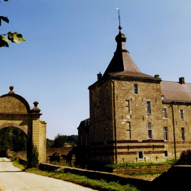 b. hek, XVIII-c, in mergel en baksteen: aan het noordelijke einde van de lengteas in de moestuin: twee bakstenen kruispijlers met rijk geprofileerde dekplaten (mergel), waarop vierkante dekselvazen (mergel); aan voor- en achterzijde van de pijlerschachten versiering in reliëf met ovale velden; aan buitenzijde der pijlers voluutvormige wangen in mergel;