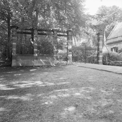 De toegangspartij ligt direct naast (Z) de portierswoning en bestaat uit vijf gemetselde pijlers. De drie linkse pijlers (vanaf Z) staan op gelijke afstand van elkaar, de afstand tussen de derde en vierde pijler is geringer dan de afstand tussen de vierde en vijfde pijler. Tussen de eerste drie pijlers bevindt zich tot op borsthoogte muurwerk, aan de bovenzijde afgedekt met hardsteen. De geringere afstand tussen de derde en vierde pijler is bestemd als doorgang voor voetgangers en de ruime afstand tussen de vierde en vijfde pijler is bestemd voor vervoer per wagen. De beide doorgangen zijn voorzien van draaibaar hekwerk in rijk gedecoreerd smeedijzer; de doorgang voor vervoer per wagen heeft dubbel hekwerk.
