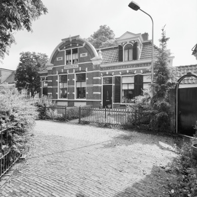 De voorgevel is opgetrokken in bruine baksteen op een gepleisterde plint en verticaal geleed door gepleisterde banden. In de voorgevel is het lokaal van de woning te onderscheiden door een hoger opgetrokken borstwering, de versiering van de gevel met diamantkoppen en de gebogen geveltop. De woning heeft een dakschild met zwart geglazuurde Friese pannen en een dakkapel. Alle lichtopeningen zijn onder een getoogde streklaag met trommelveld gemetseld met gekleurde baksteen; T-vensters.