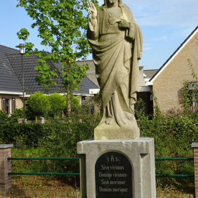 - Van architectuurhistorische waarde als goed voorbeeld van een vrijstaand natuurstenen Heilig Hartbeeld geplaatst op een gepleisterde sokkel in een plantsoen afgesloten door een ijzeren hekwerk.