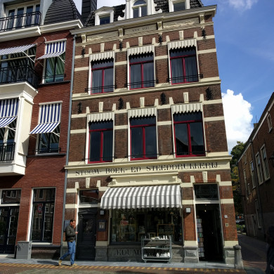 Vanuit een L-vormige plattegrond opgetrokken, min of meer complexmatig geheel met de drukkerij. Drie bouwlagen tellend winkel-woonhuis onder een met bouletpannen (onderste dakschilden) en zinken roeven (flauw hellende bovenste dakschilden) gedekt gebroken zadel-/mansardedak. Symmetrische, in baksteen opgetrokken voorgevel met accenten van gepleisterde baksteen boven een plint van hardsteen en rechtgesloten gevelopeningen met kwartrond profiel in de neghoeken. Begane grond met etalagevenster boven een hardstenen plint met "EDUARD IJDO" in verdiepte letters.