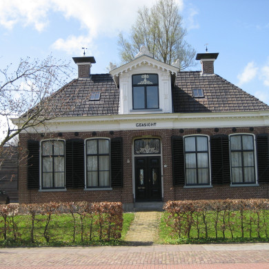 Het WOONHUIS "Gea-sicht", van het type rentenierswoning, ligt aan de zuidelijke rand van het dorp, aan de lange noord-zuidweg die Oppenhuizen met het dorp Uitwellingerga verbindt. Het naar het oosten gerichte pand ligt teruggerooid ten opzichte van de weg en bevindt zich op een smal, rechthoekig perceel waarvan de smalle hoek naar het westen is gelegen. Het huis is in Ambachtelijk-traditionele stijl gebouwd; in het interieur zijn decoratieve elementen toegepast in de stijl van de Art Nouveau. De gedenksteen memoreert: "De eerste steen gelegd door Wieger H. Visser den 4 maart 1874". Deze W. Visser hoorde (volgens mondelinge overlevering) bij de rijke palinghandelaarsfamilie Visser, die door haar rijkdom veel invloed had in de omgeving en zodoende zowel economisch als maatschappelijk een belangrijke rol heeft gespeeld in de streek aan het einde van de 19de en het begin van de 20ste eeuw.