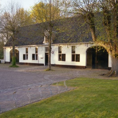 KOETSHUIS, XVII; op rechthoekige plattegrond;baksteen, de voorgevel witgekalkt; één bouwlaag onder zadeldak met grijze pannen aan voorzijde en rode aan achterkant; voorgevel symmetrisch: in het midden een éénvoudige deur met bovenlicht (meerruitsindeling), links en rechts aan de buitenzijden telkens een ronde dubbele koetsdeur; tussen deze deuren en de middendeur telkens twee halve kruisramen met onderluiken; boven middendeur een dakkapel; boven rechter koetsdeur een sluitsteentje met GvS en parelkroon, XVII. In de zijgevels onder meer ramen met meerruitsverdeling en halve luiken.