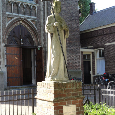 BEELD van de H. Odulphus uit ca. 1911. Het beeld van Franse kalksteen stond voor 1960 in de topgevel van het gesloopte parochiehuis Odulphus rechts van de pastorie.