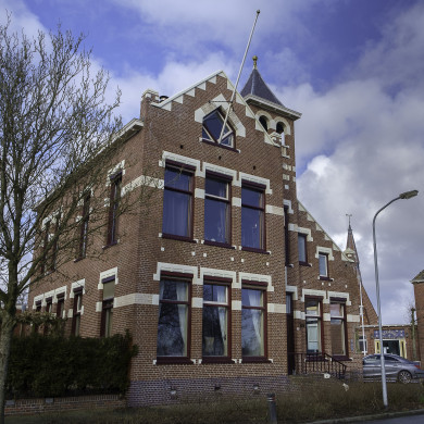 GEMEENTEHUIS uit 1915, bestaande uit een gedeelte van twee bouwlagen hoog waar een aankapping tegenaan is gezet. Beide delen worden van elkaar gescheiden door een torendeel dat de entree markeert. Het pand is opgetrokken in een roodbruine baksteen op een trasraam van donkere klinkers. Voor- en zijgevels hebben gevelbanden van crème-kleurige verblendsteen. Het samengestelde dak is gedekt met een nieuwe Hollandse pan en heeft een houten goot op klossen. De H-vensters, gekoppeld of enkelvoudig, worden afgesloten door een gepleisterde latei en hebben gepleisterde vlakjes ter hoogte van de middendorpels.