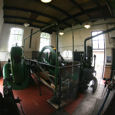 Het machinehuis heeft een rode tegelvloer met zwarte randen. Op de muren een tegellambrizering van crèmegele tegels met zwarte rand. In de oostmuur twee plaquettes: de linker herinnert aan het omschakelen van het stoomgemaal tot dieselgemaal in 1930. De rechter plaquette geeft de eerste steen-legging aan. In het machinehuis bevinden zich de Crossley dieselmotor van 126 PK (fabricage nr. 108934 type 0-126) en de Storkpomp. In het ketelhuis is nog een groot deel van de stoomketel aanwezig.