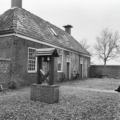 XVIII; ten westen van het huis, gelegen in de gracht, d.w.z.: de korte gevels (noord- en zuidgevel) staan in de gracht; bakstenen rechthoekig gebouw van één bouwlaag onder schilddak met blauw verglaasde pannen; twee schoorstenen met borden; meerruits ramen; tussen huis en dienstgebouw een ommuurde binnenplaats, waarvan de inrichting van ondergeschikt belang is.