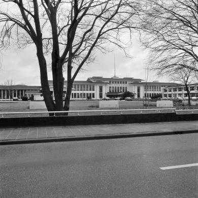 Het gebouw is uitgevoerd in een gewapend betonskelet met gewapend betonvloeren en -daken. De gevels zijn in baksteen opgetrokken en witgesausd met uitzondering van de plint, waarin zich smalle horizontale keldervensters bevinden.