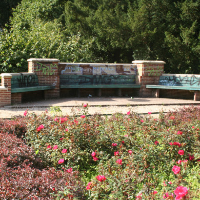 De zitbank bestaat uit in rode baksteen opgetrokken muurtjes met kunststenen afdekplaten en gemetselde plantenbakken waartegen houten zittingen en rugleuningen zijn bevestigd. Het is opgebouwd uit een rechte lange bank en geknikte zijarmen met korte banken; daarvoor een iets verhoogde bestrating. Boven de centrale bank een kunststenen fries met inscriptie (zie inleiding). Aan weerszijden van het fries gemetselde holle pijlers.