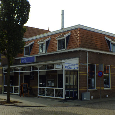 Op de hoek van de Stationsstraat en de Van Leeuwenstraat gelegen voormalig CAFé met WOONHUIS (café 'de Sportwereld', thans restaurant/woonhuis), in de rooilijn van de straat. Vrijstaand gebouw met links opzij een steeg met houten poort van het buurpand.